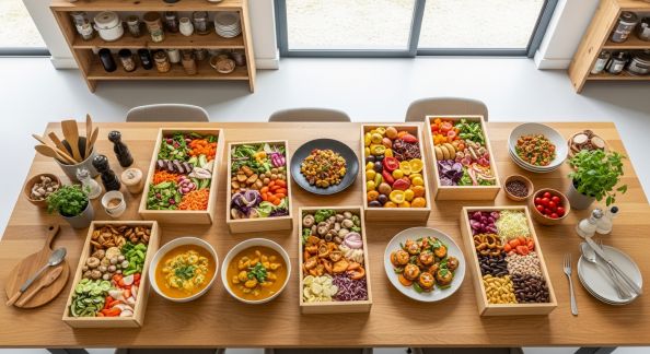 Un menu batch cooking bien construit vise à fournir chaque jour un repas complet : source de protéines (animales ou végétales), accompagnement de légumes variés, part de féculents ou céréales, et un produit laitier ou une alternative selon les préférences. On veille aussi à la variété des couleurs et des textures pour aiguiser l’appétit sans routine.