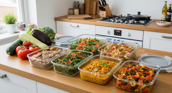 - Anticipez des repas simples et complets sur 3-4 jours (batch cooking : curry de pois chiches, salade de riz-quinoa à l’avance, houmous, galettes végétales).